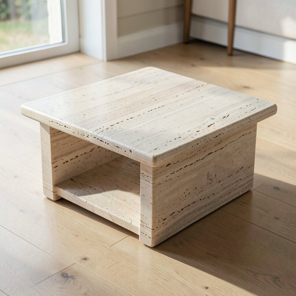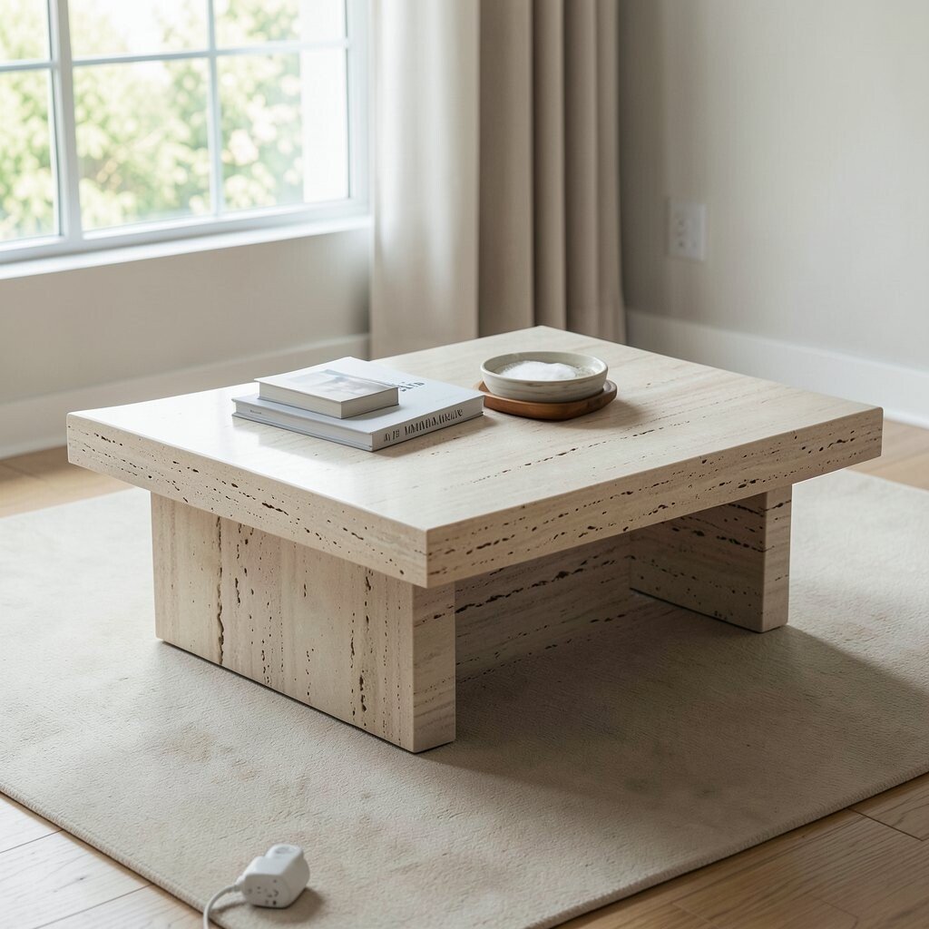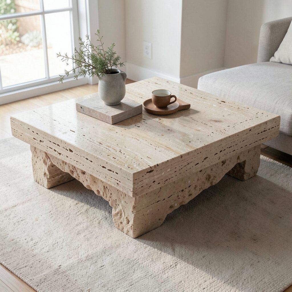 A minimalist travertine coffee table can instantly lift your space. Its clean lines and simple form bring a sense of calm and order.