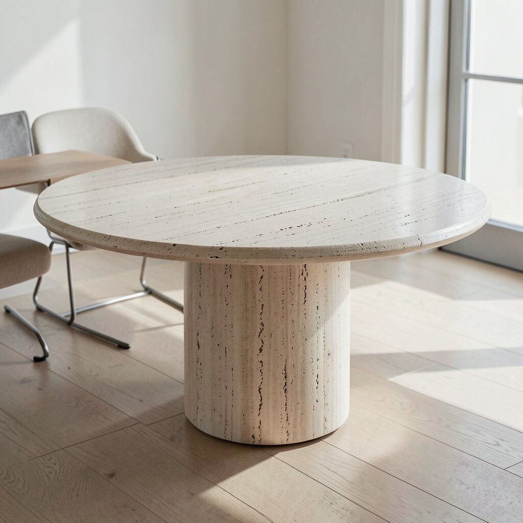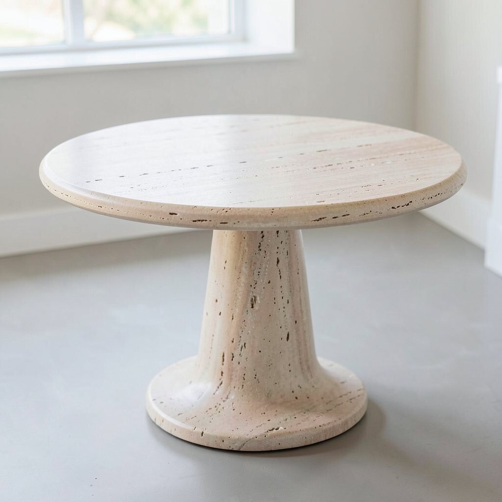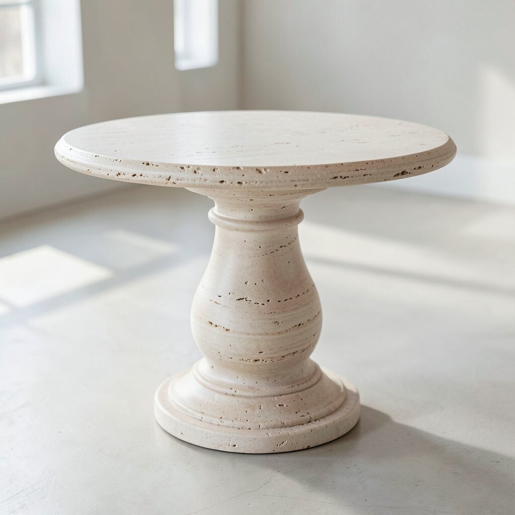 The travertine pedestal table is a true statement piece. Its sculptural design draws the eye and sparks conversation.