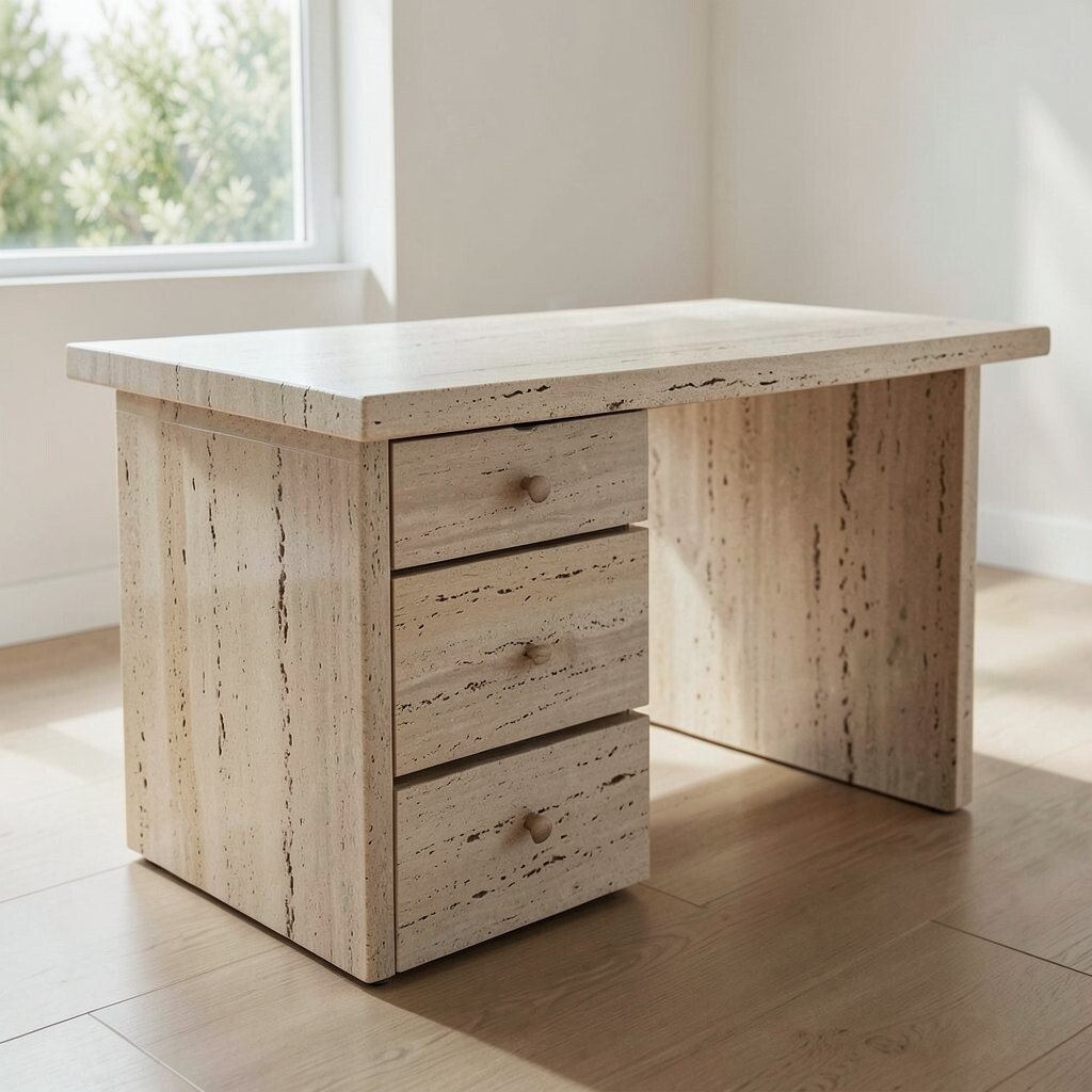 A travertine console table with drawers offers style and storage. It’s perfect for an entryway or living room.