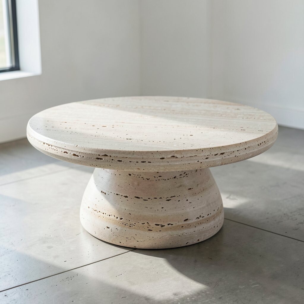 The round travertine coffee table offers a soft, inviting aesthetic. Its circular shape encourages conversation and connection.