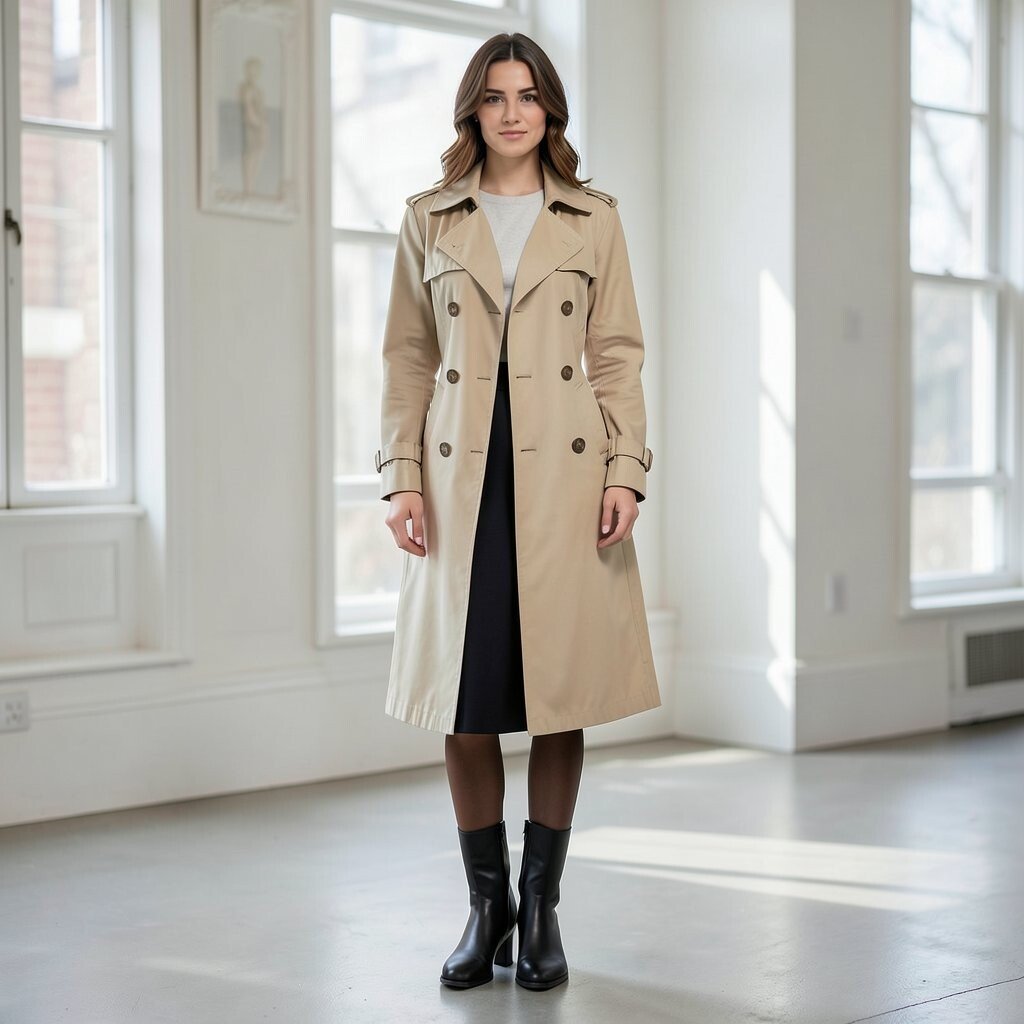 Pairing a trench coat with a skirt and boots creates a balanced and stylish look. This outfit is perfect for transitioning between seasons.