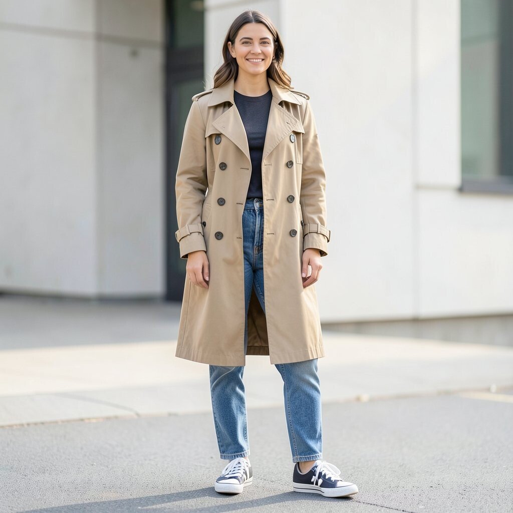 Pairing a trench coat with sneakers creates a laid-back and casual look. It’s perfect for weekend outings and relaxed gatherings.