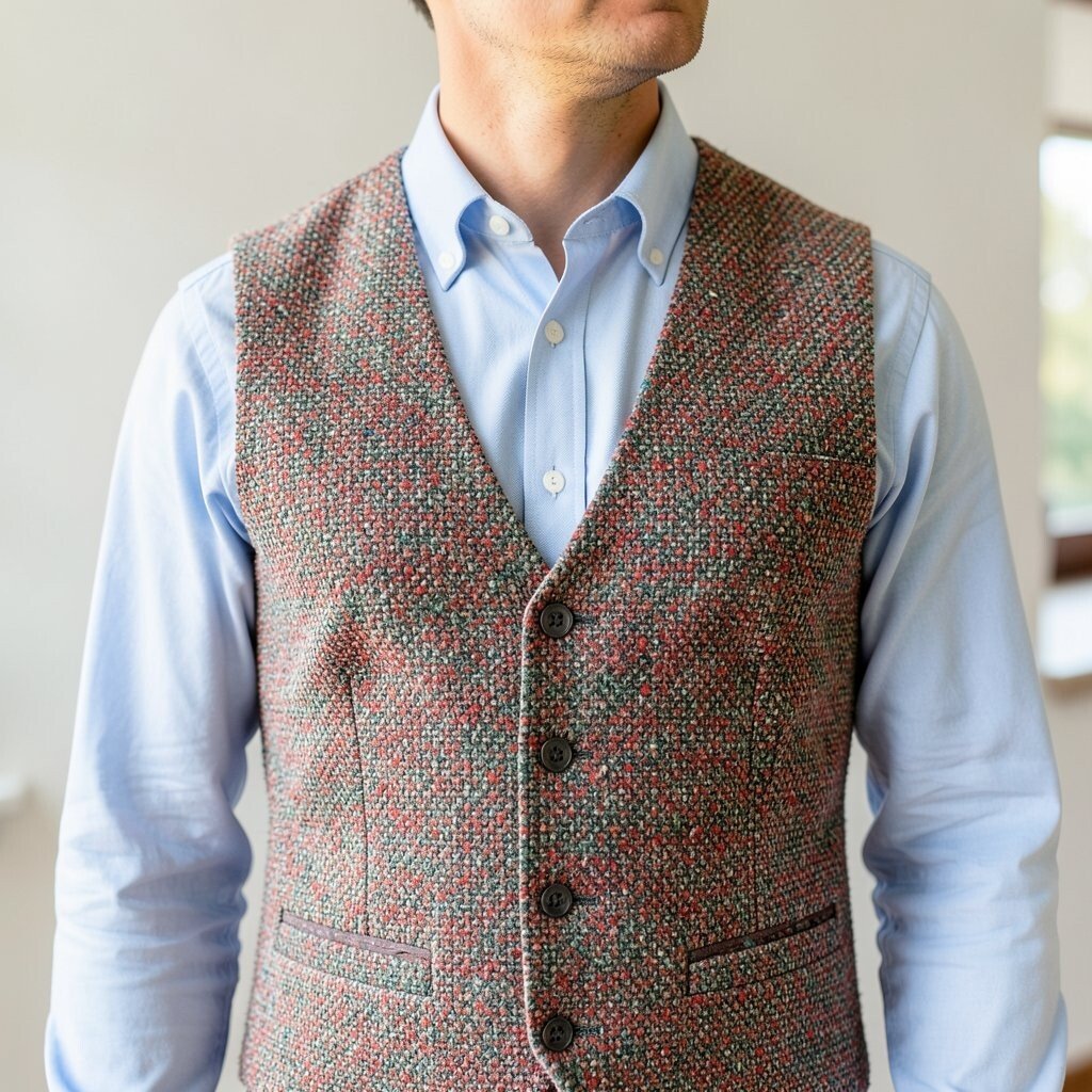 A tweed vest adds a smart layer without making the outfit feel too heavy. It can sit nicely over a crisp shirt and give the body a tidy shape.
