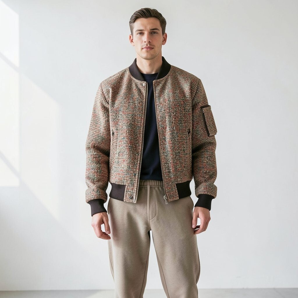 This mix is great for travel, errands, or weekend hangouts. It feels fresh because tweed is usually formal, but the bomber shape makes it casual. Try a plain tee underneath to keep the look clean.