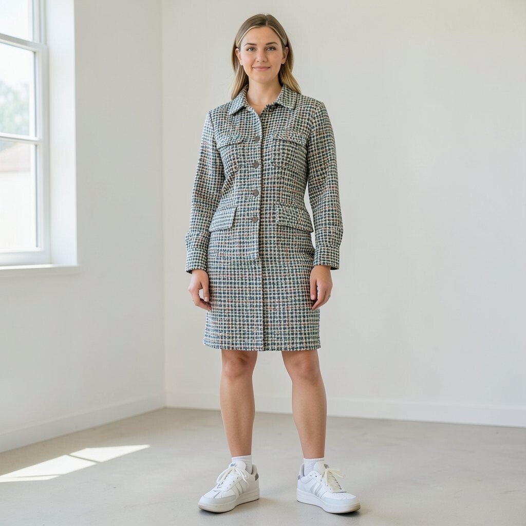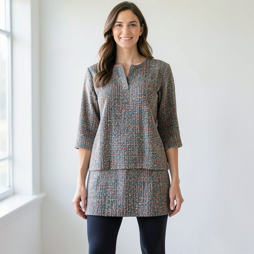 This is a useful choice for busy mornings and casual plans. It gives the richness of tweed without needing a full dress or suit. A tunic with a soft drape can feel kinder to move in than a stiff jacket.
