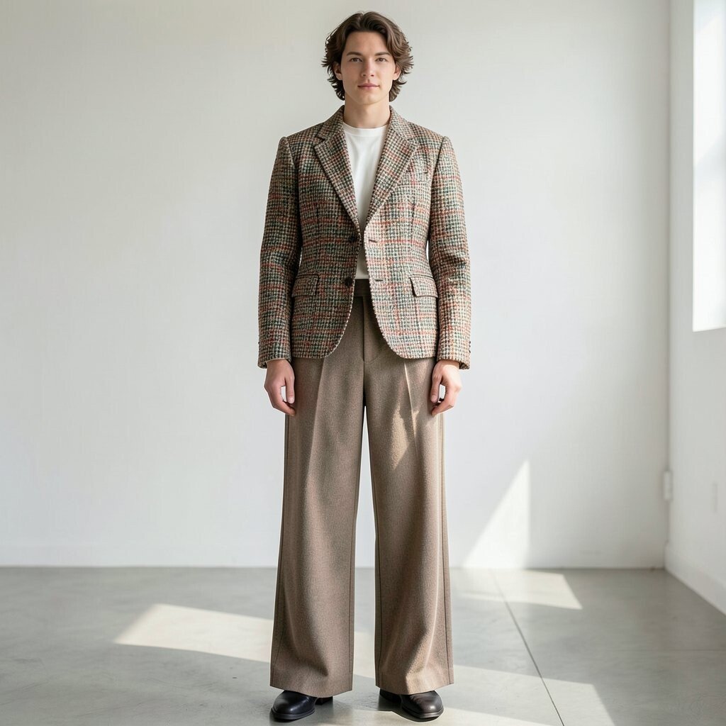 This outfit works well for office days and smart lunches. It feels unique because the mix of fitted and loose pieces gives the eye something interesting. Try soft beige, gray, or brown for a classic look, or choose a brighter tweed for more energy.