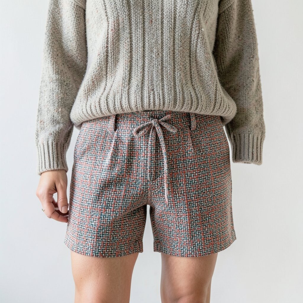 Tweed shorts can look cute and neat when paired with a soft sweater. The mix of crisp weave and fuzzy knit makes the outfit feel balanced.