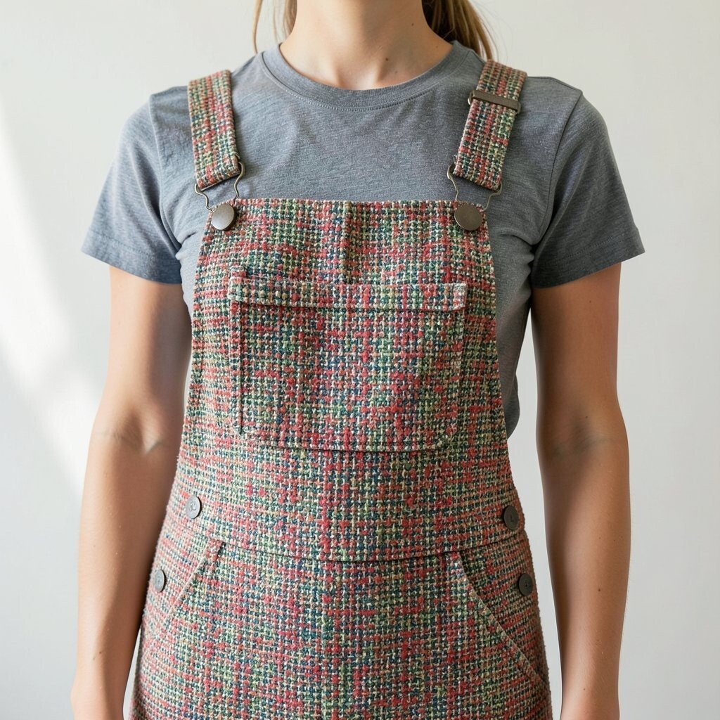 This is a fun outfit for casual days when you still want to look styled. It feels unique because tweed is not the usual choice for overalls. Pick a simple tee in white, black, or cream so the fabric texture stands out.