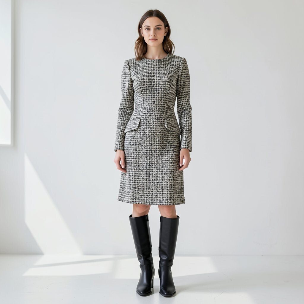 A tweed dress feels smart and put together without much effort. Tall boots give it a sleek finish and help balance the heavier fabric.