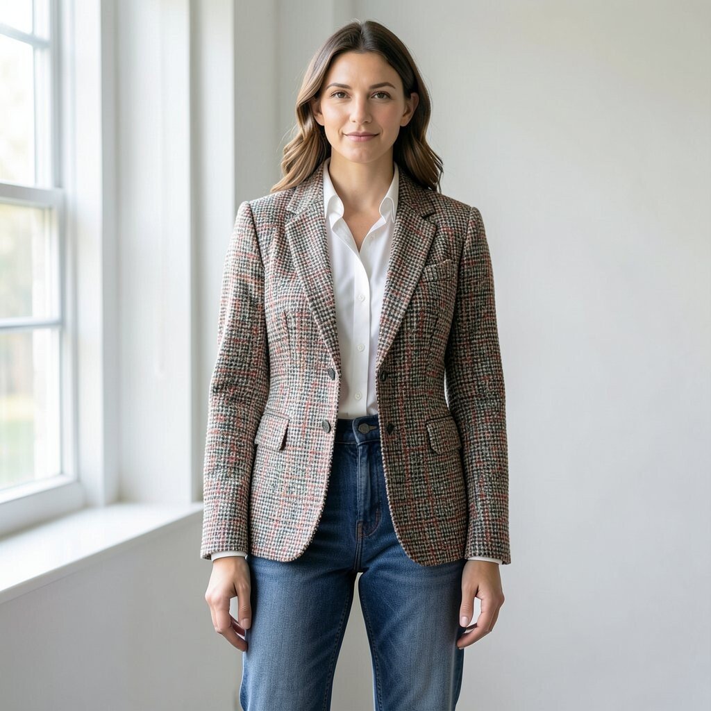 A tweed blazer over straight jeans gives a neat, easy look. The rough weave adds texture, while denim keeps it relaxed.