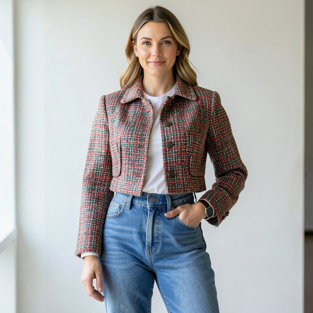 Short jackets are very current, and tweed makes them feel richer. Flat shoes or ankle boots can both work, depending on how polished you want the outfit to feel.