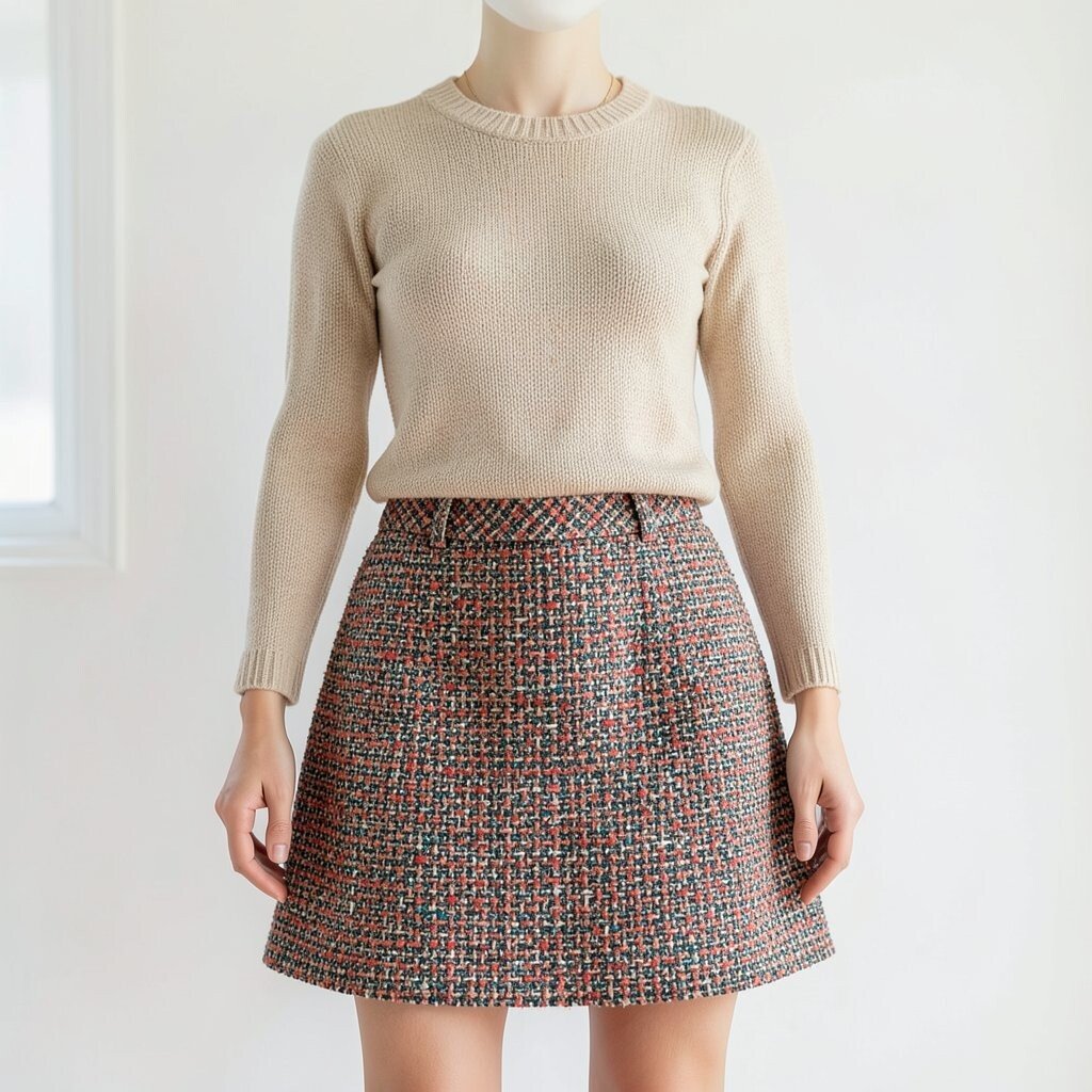 This outfit works well for church, dinner, or a nice day out. It feels special because tweed adds structure while the skirt brings movement. If you choose softer tweed, the whole look can feel lighter and easier to wear.
