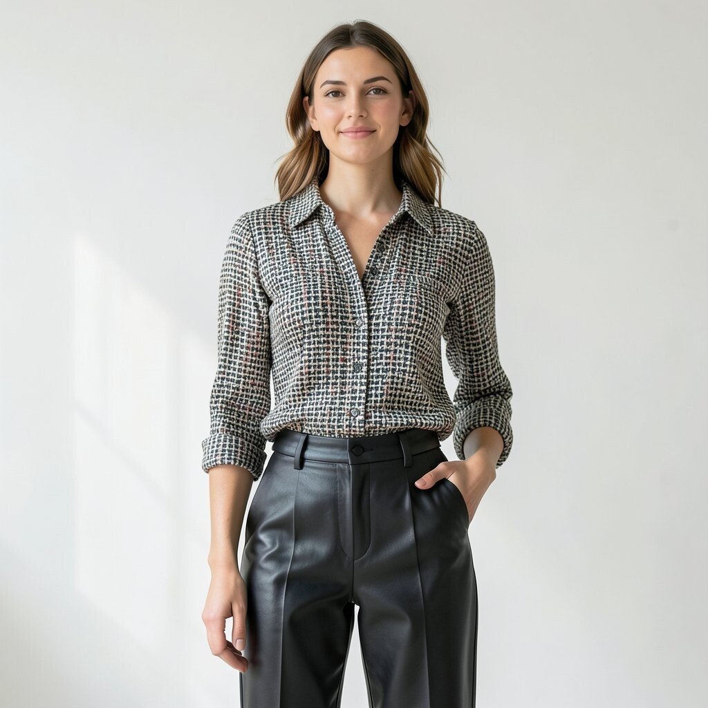 Tweed and leather-look pants make a cool mix of soft and strong. The blouse brings texture, while the pants add shine and edge.