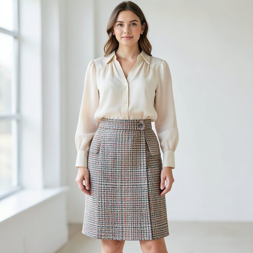 A tweed pencil skirt gives a smart, shaped look that feels neat right away. A soft blouse makes the outfit gentler and keeps it from feeling too stiff.