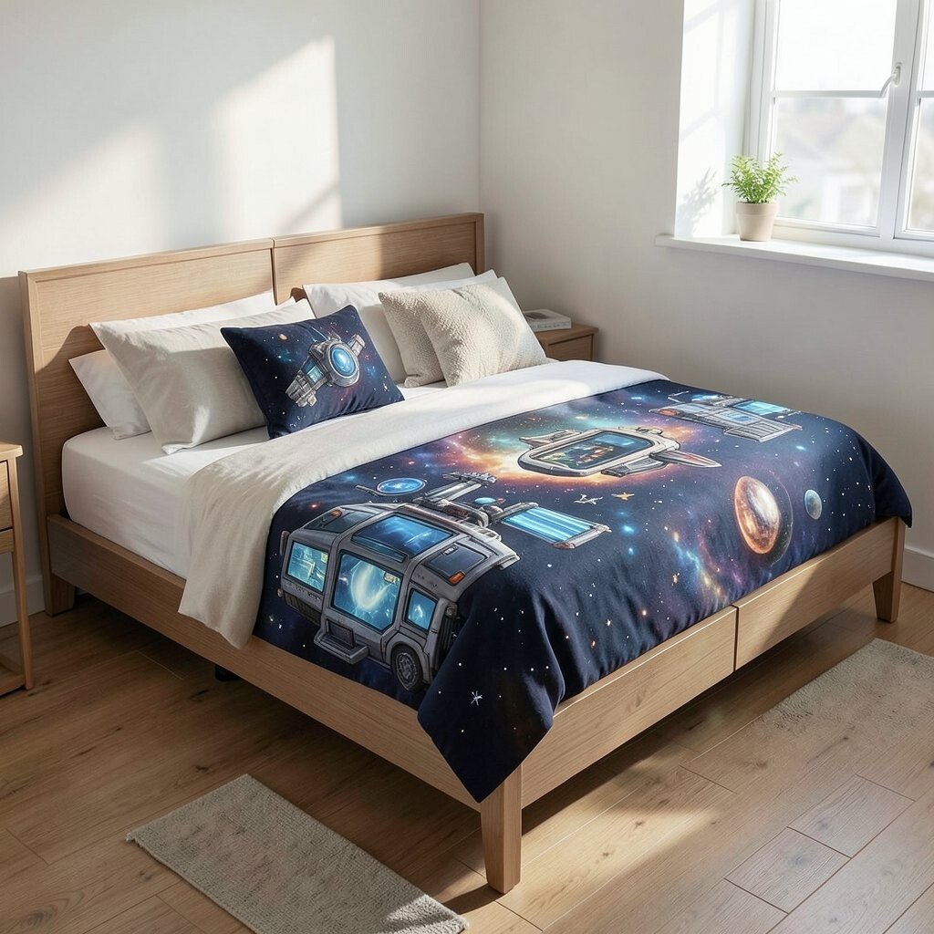 LED lights can mimic a starry sky, enhancing the cosmic feel. This setup is perfect for aspiring astronauts and sci-fi fans.