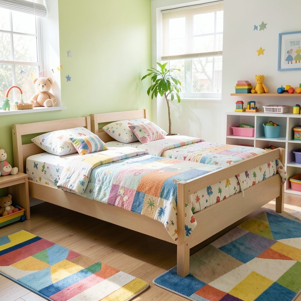 A twin floor bed with modern geometric patterns offers a sleek and stylish look. Use bold shapes and contrasting colors for a contemporary vibe.