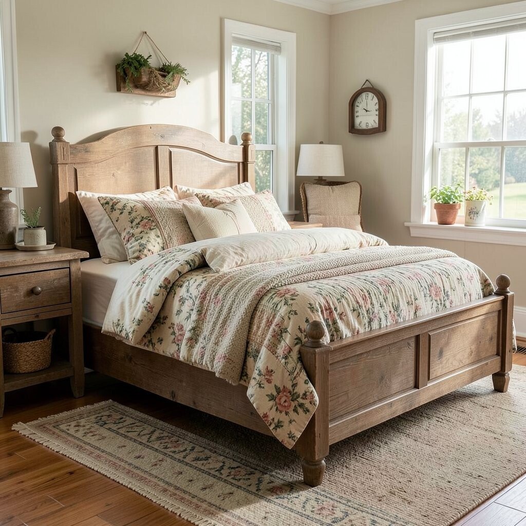 You can add family heirlooms or handmade quilts for a personal touch. It’s a timeless look that feels homey and inviting.