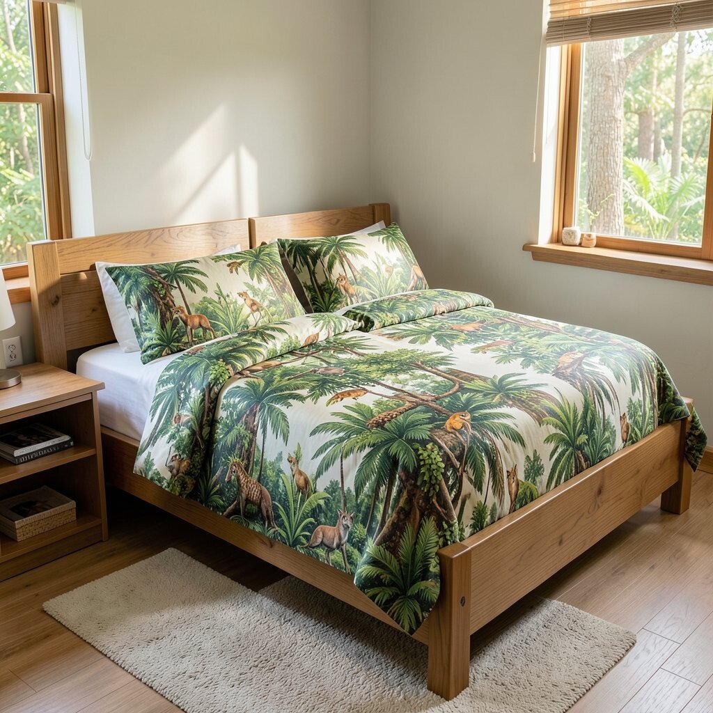 Bring the wild inside with a jungle safari-themed twin floor bed. Use animal prints, green hues, and leafy decorations.