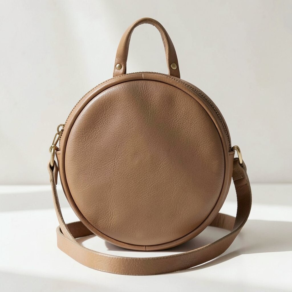 Circular crossbody bags in vegan leather offer a playful twist on traditional designs. Their unique shape is eye-catching and fun.