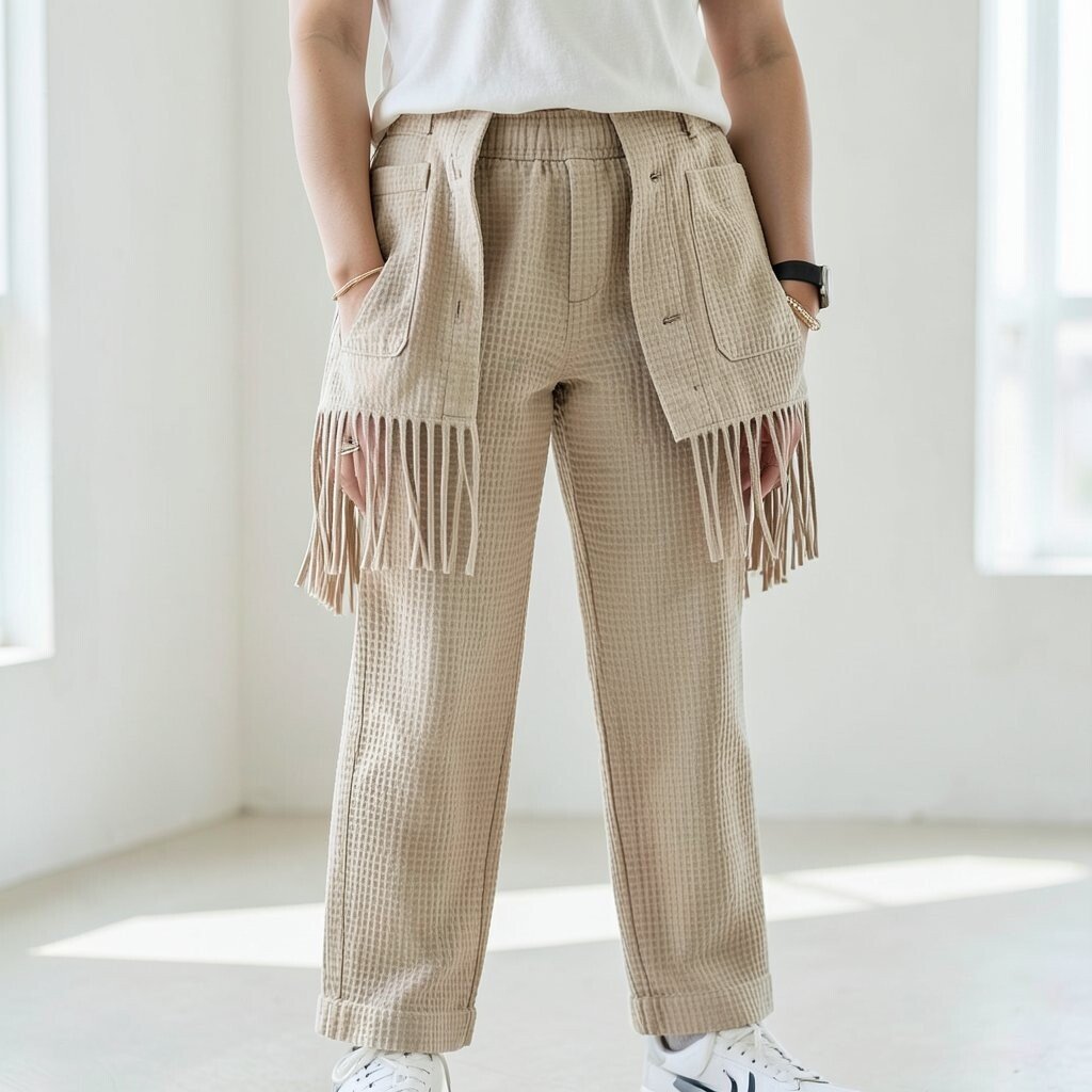 Fringe jackets are a trendy piece, making this a contemporary choice for the fashion-savvy. The combination is both playful and stylish, offering a unique way to wear waffle pants.