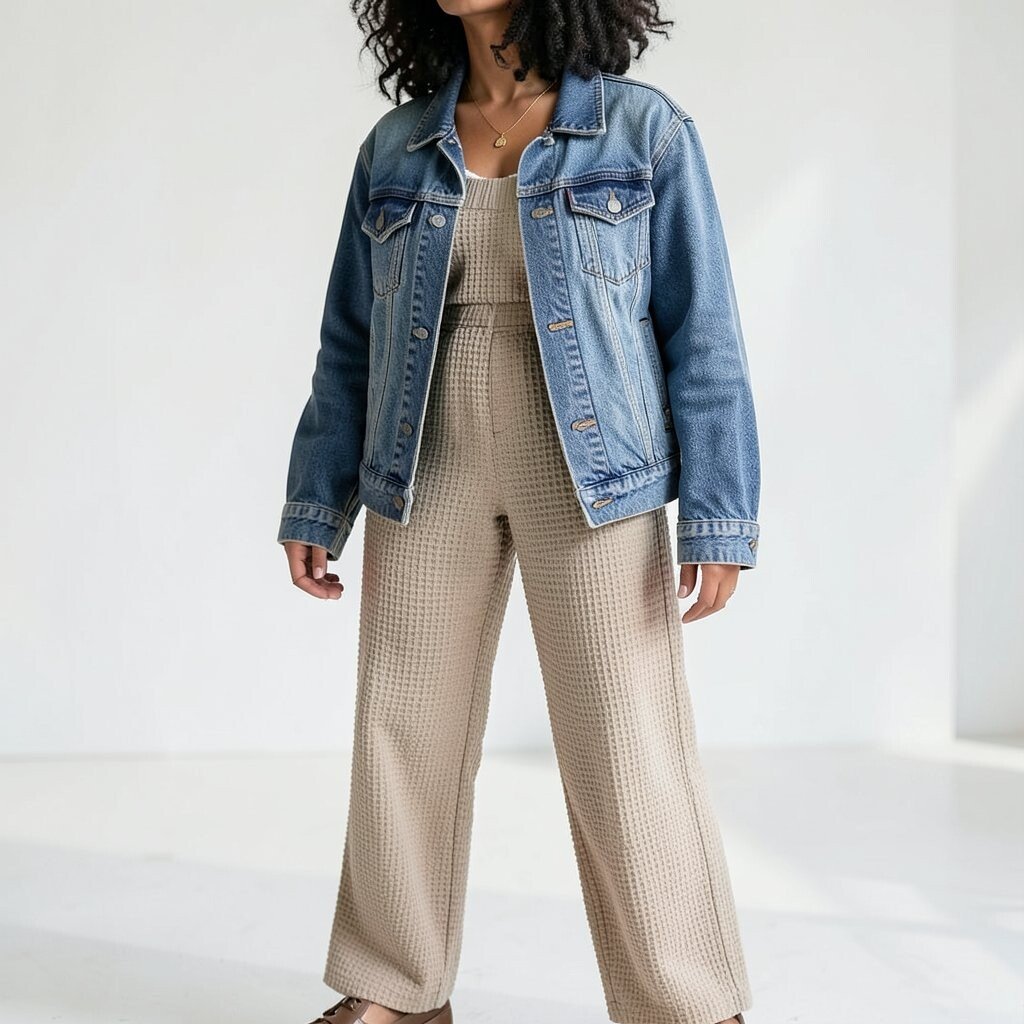 Layering your waffle pants with a denim jacket provides a stylish, casual look that’s perfect for transitional weather. Denim always adds a cool factor to any outfit.