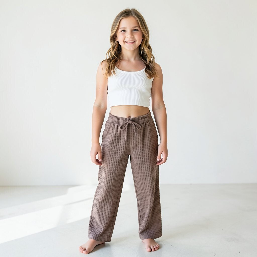 Cropped tops add a playful twist to waffle pants. This combination is perfect for warmer days when you want to feel breezy and free.