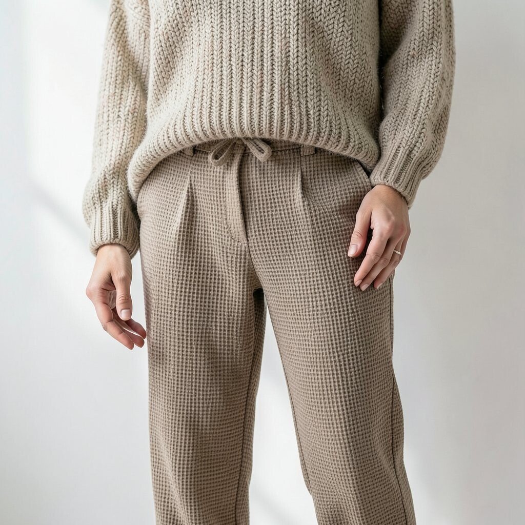 Imagine yourself wrapped in a chunky knit sweater paired with earth-toned waffle pants. The combination is perfect for a chilly day indoors or a casual outing.