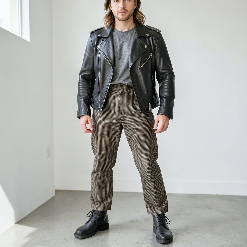 A leather jacket paired with waffle pants adds an edgy touch to your outfit. This combination is perfect for a night out or a concert.