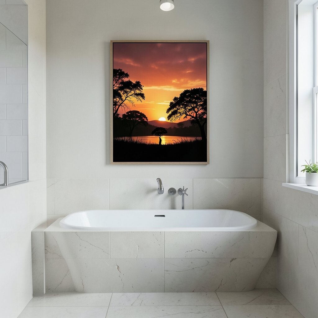 Infuse your bathroom with warmth using desert landscape prints. The sandy hues and cacti create a serene, earthy vibe. They’re great for adding a touch of the Southwest to your home.