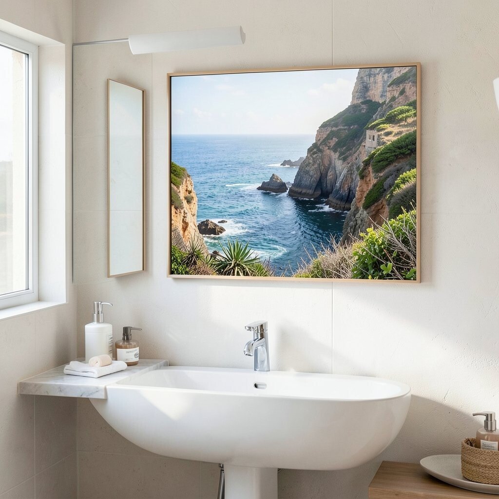 Feel the power of nature with coastal cliff photography. These dramatic images capture towering cliffs and crashing waves, adding energy to your bathroom decor.