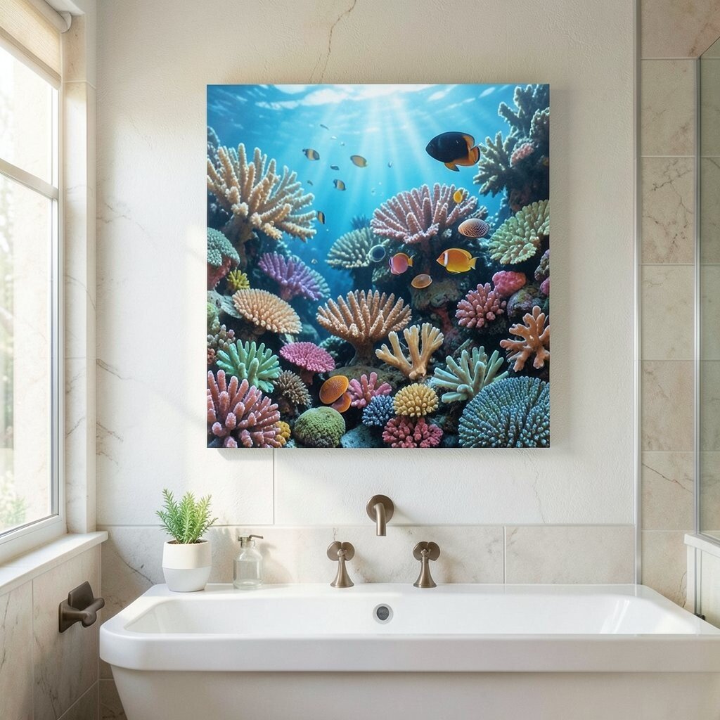 Coral reef art is great for adding color and life to a bathroom. Prices range from $25 to $75. Complement with sea-themed decor for a cohesive marine look.