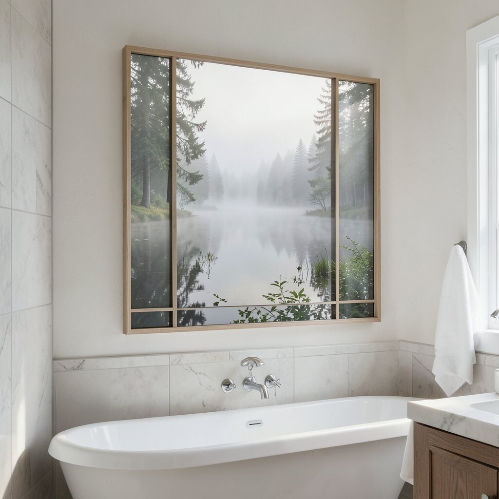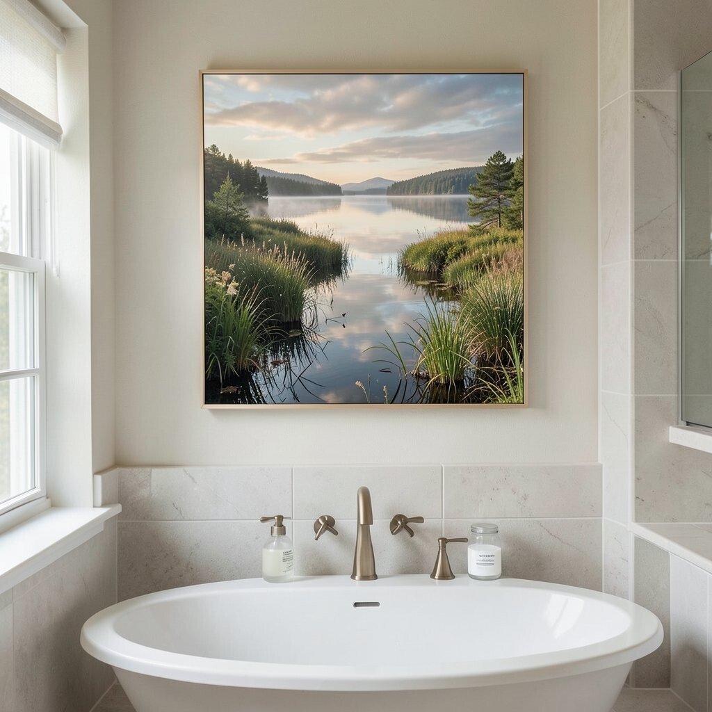 Capture the serene beauty of a foggy morning with lake prints. The misty water and soft lighting create a tranquil atmosphere, ideal for a calming bathroom retreat.