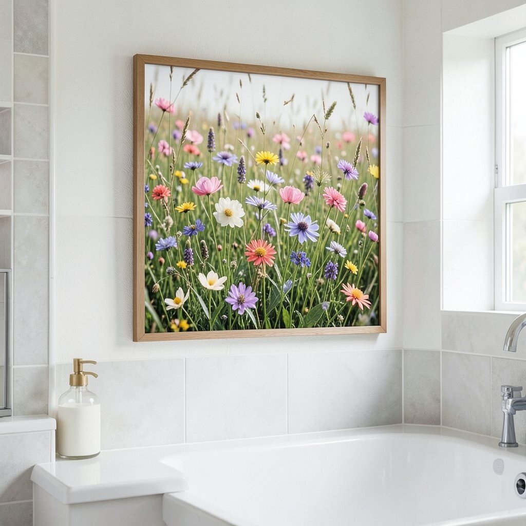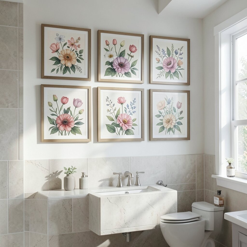 Mix and match different flowers for a dynamic display. These prints are often affordable, typically under $20 each. Complement with floral-scented soaps for a fresh feel.