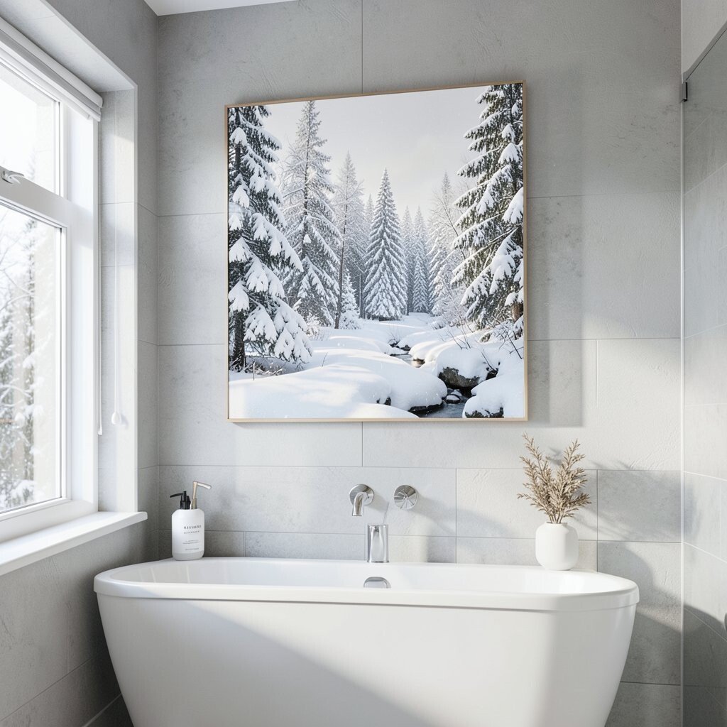 Embrace the tranquility of winter with snowy forest scenes. The crisp whites and serene landscapes create a calming effect, ideal for relaxing baths.