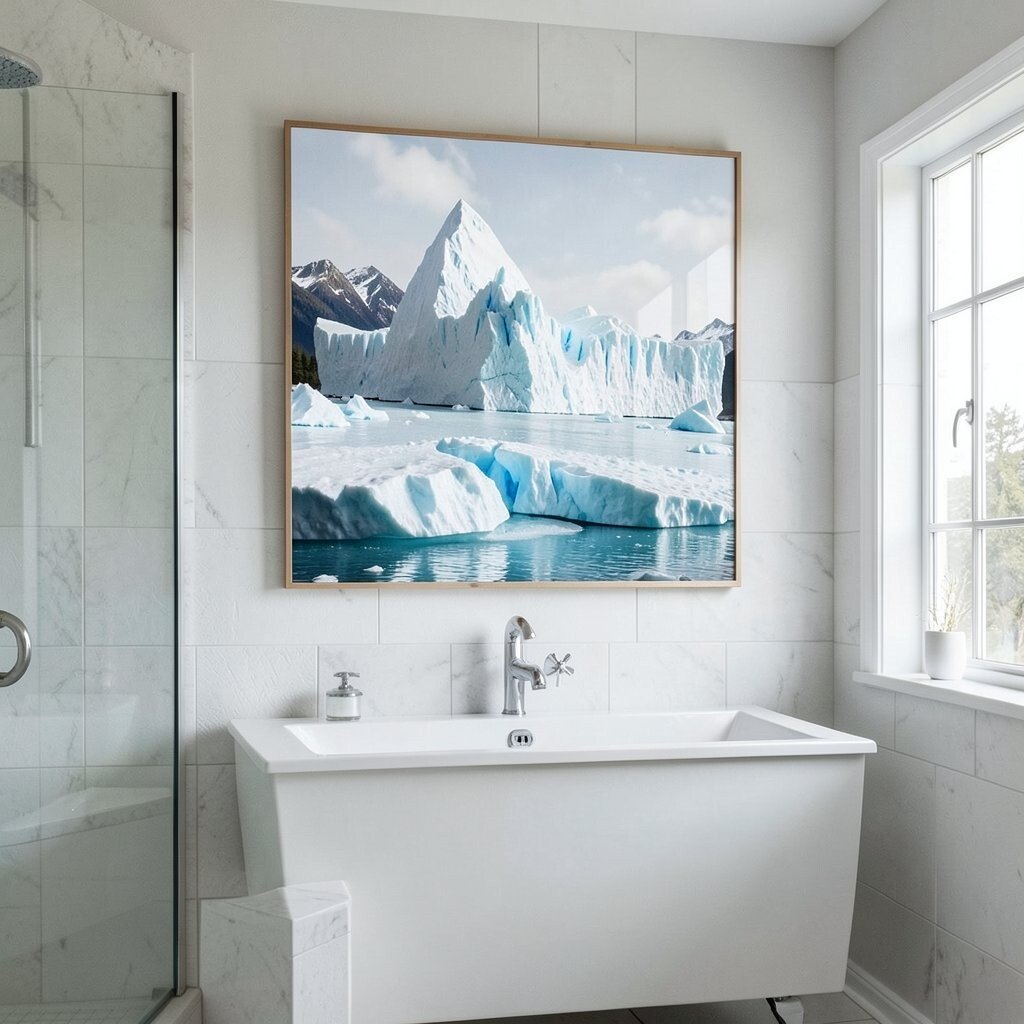 Marvel at the grandeur of icebergs with stunning photography. The icy blues and whites create a fresh, crisp atmosphere, perfect for cooling down hot showers.