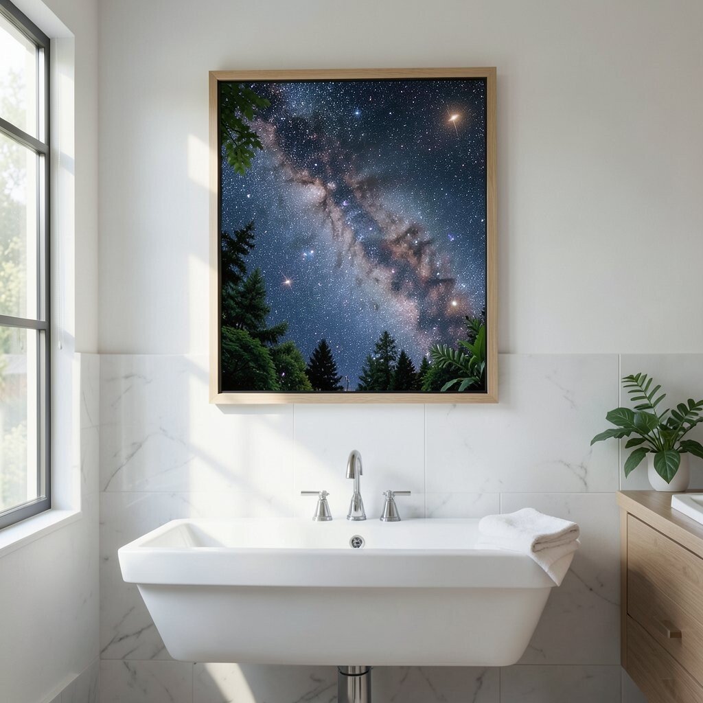 Admire the beauty of the cosmos with starry night sky art. These pieces capture the twinkling stars and deep blues of the night sky, adding a touch of magic to your bathroom.