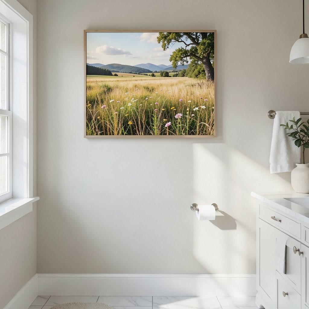 Bring the peacefulness of the countryside into your bathroom with field art. These pieces depict rolling hills and open fields, offering a sense of freedom and openness.