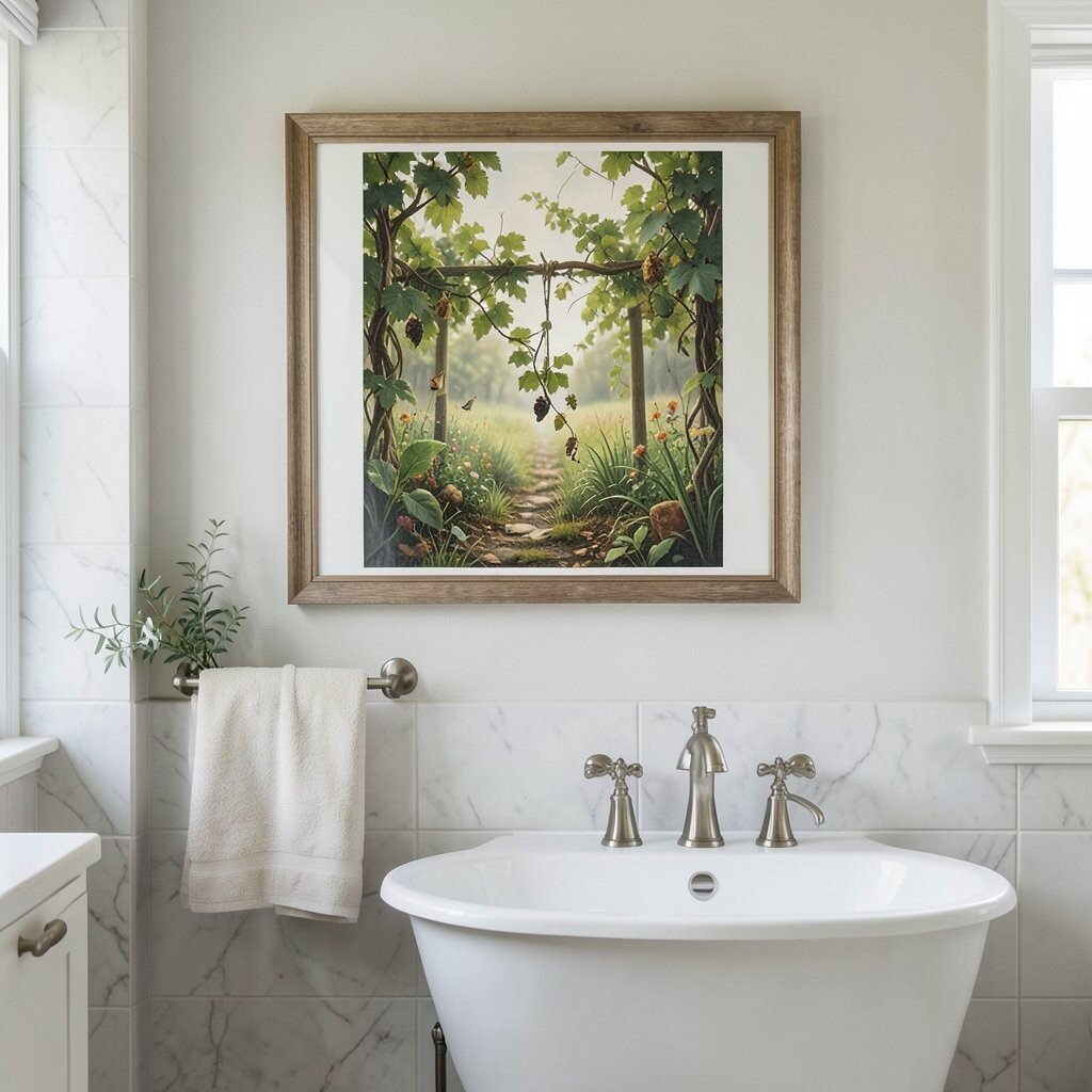Bring the romance of vineyards to your bathroom with vineyard art. The lush grapevines and rolling hills offer a sense of warmth and abundance.