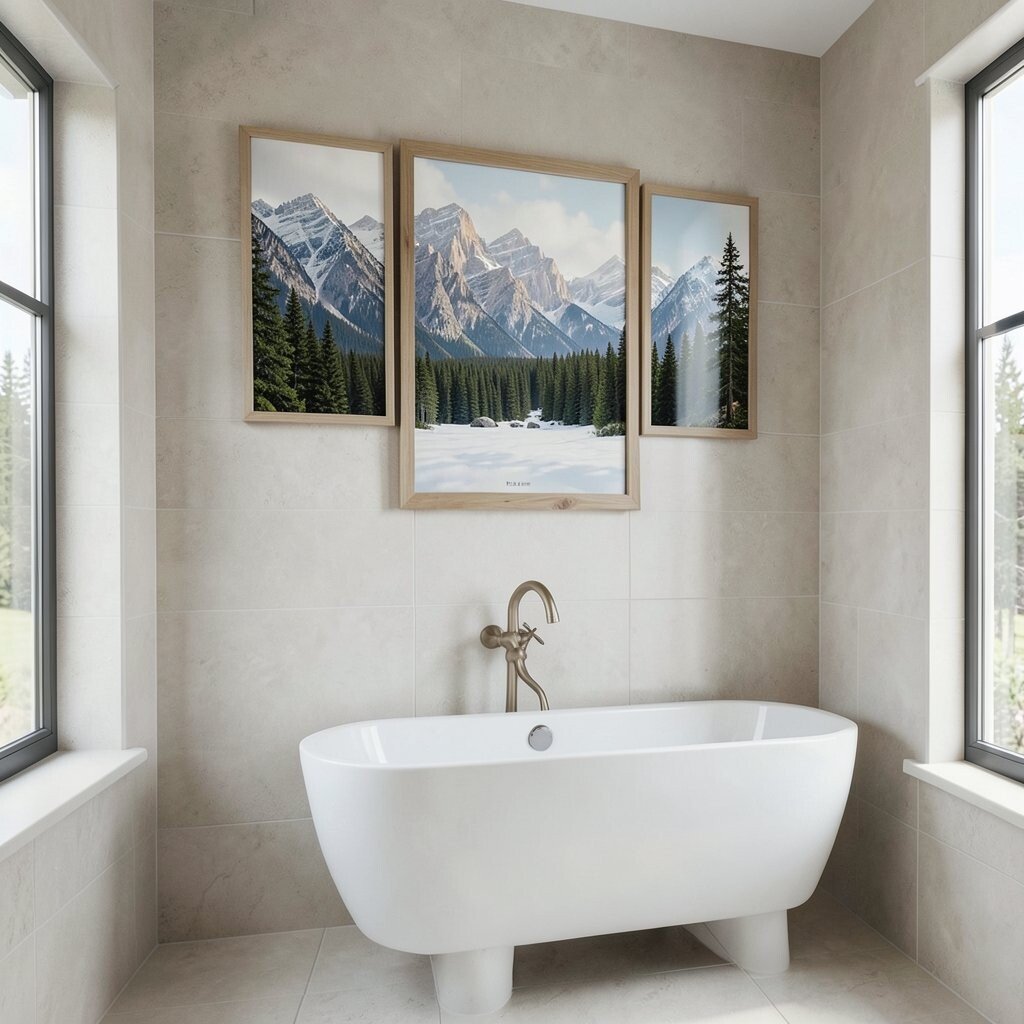 Misty forest prints bring a sense of calm and mystery to your bathroom. The soft, foggy trees create a peaceful vibe, making it perfect for unwinding after a long day. Hang a series of three for a panoramic effect.