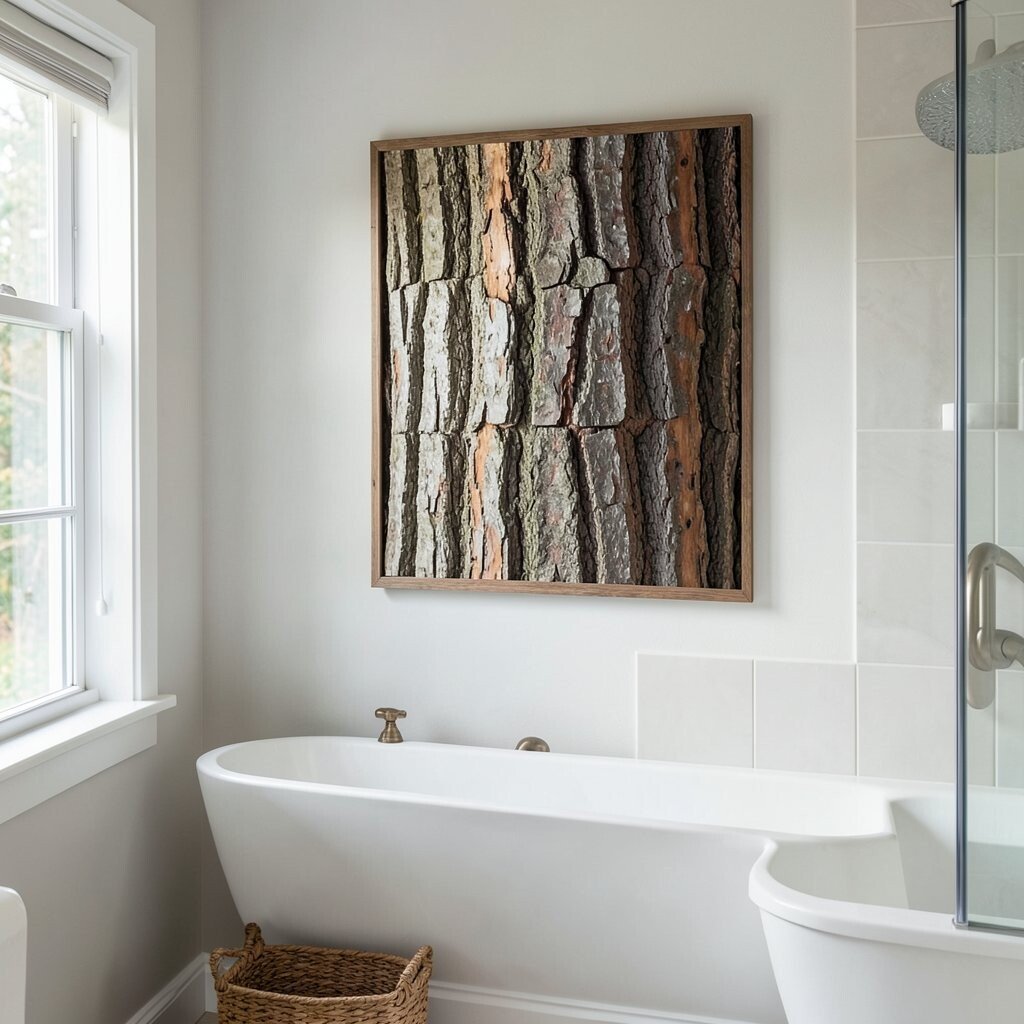 Embrace natural textures with rustic tree bark art. These pieces highlight the intricate details of tree bark, offering a tactile experience. They’re perfect for rustic or bohemian-style bathrooms.