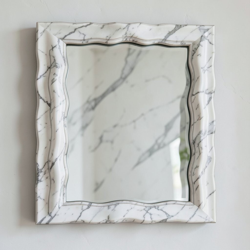 A wavy mirror with a marble frame adds luxury and sophistication. The natural stone offers a timeless appeal.