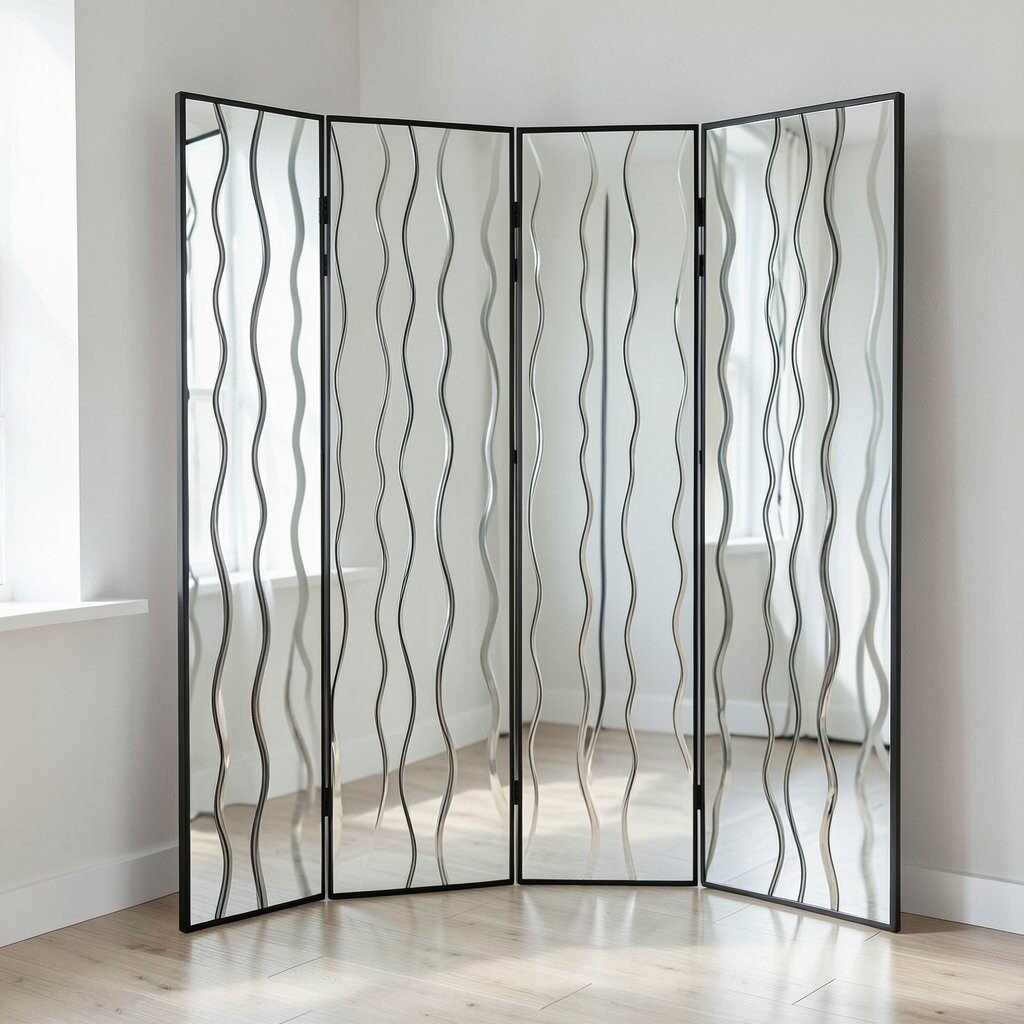 This type of mirror is ideal for studios or lofts where separation is desired without losing light. The wavy design adds a modern twist to traditional room dividers.