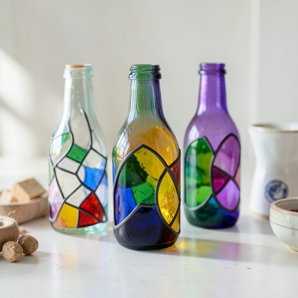 Turn glass bottles into colorful decor with a stained glass effect. Use glass paint to create vibrant patterns that catch the light beautifully. These bottles make charming vases or decorative pieces.
