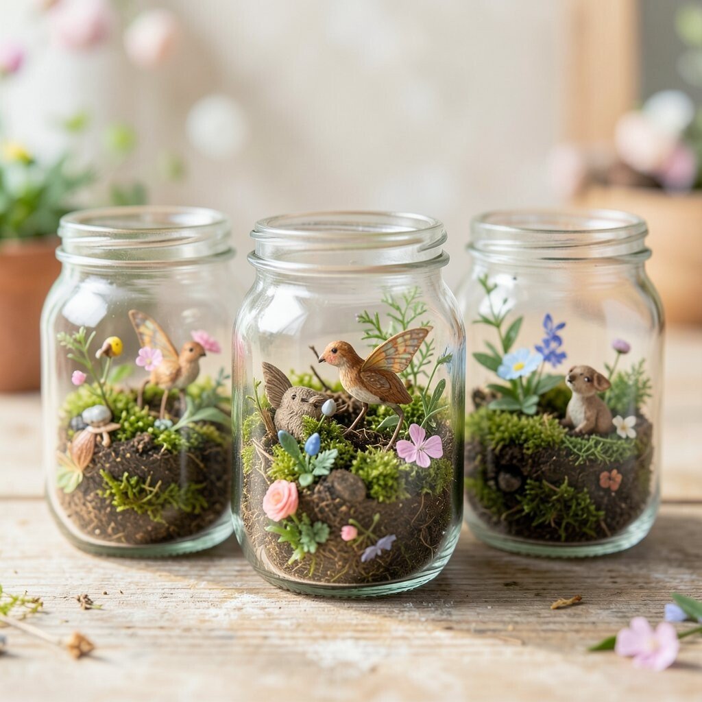 These gardens can be as low-cost or fancy as you want. Use found stones and twigs for a budget version, or buy tiny figures for a more polished style. Personal touches like a painted sign or a tiny path make the jar feel special.
