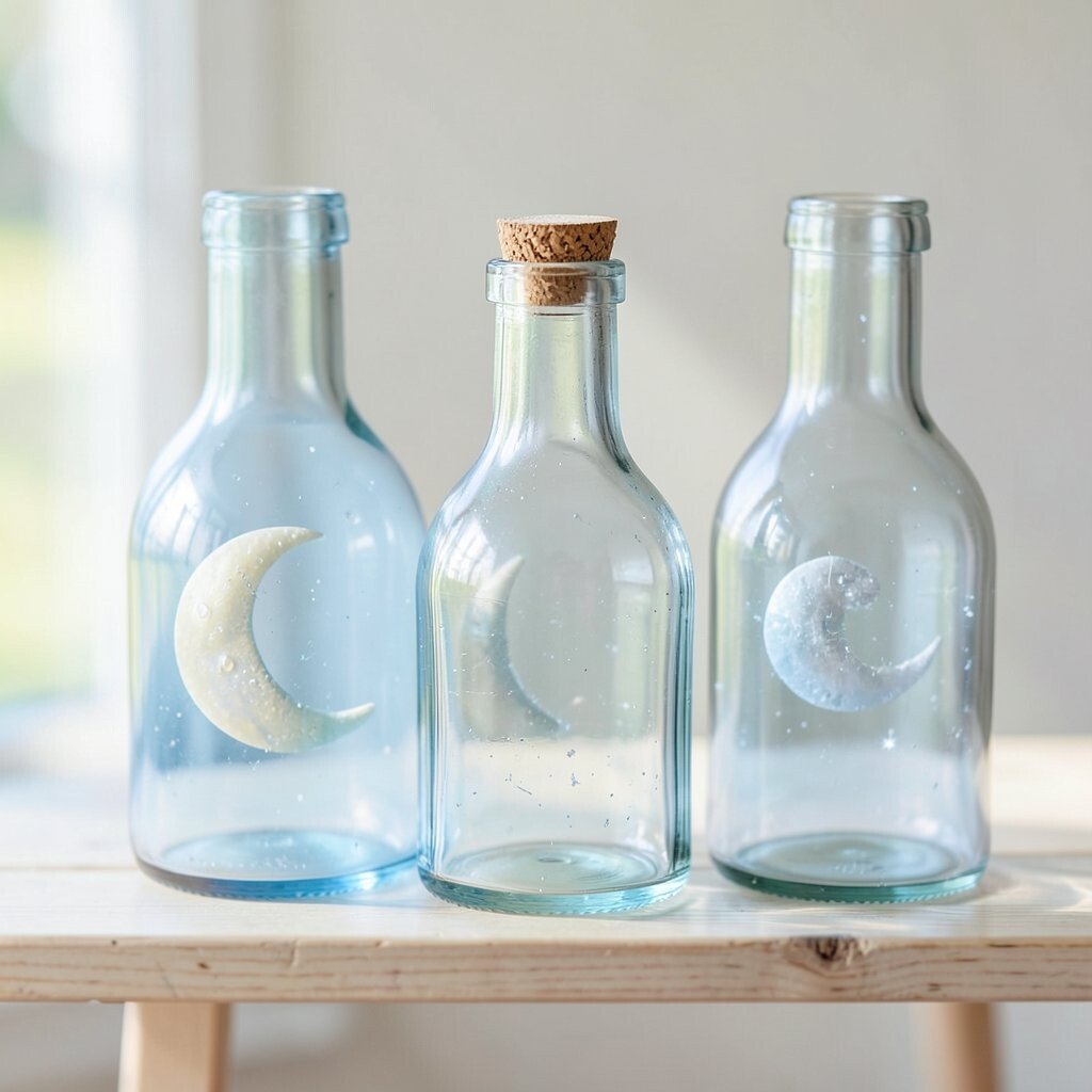 Clear bottles can glow like tiny moons when painted with soft silver and blue tones. A bit of sparkle inside makes them look like they hold night sky magic.