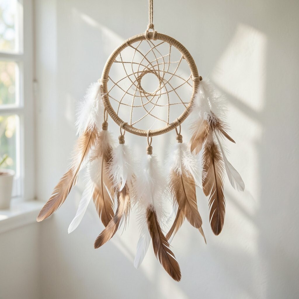 Dream catchers with soft feathers and woven rings look airy and peaceful. Their hanging strands move gently and add texture to a wall.