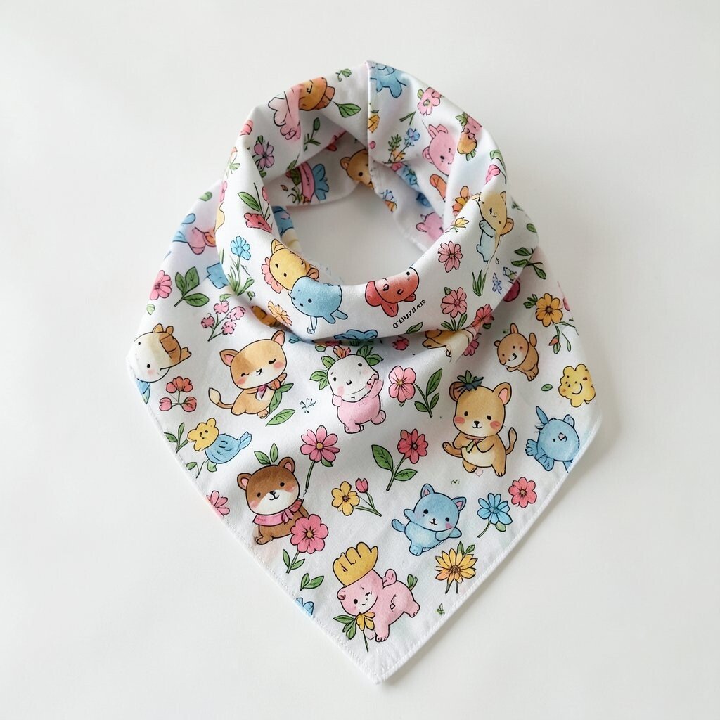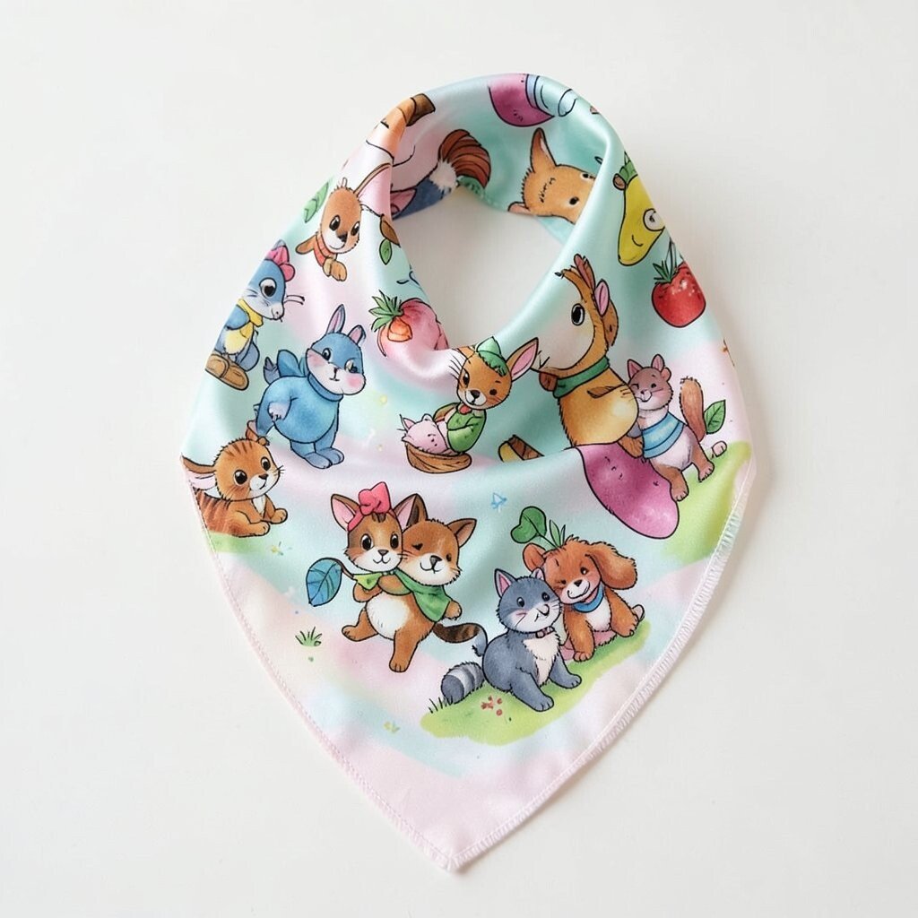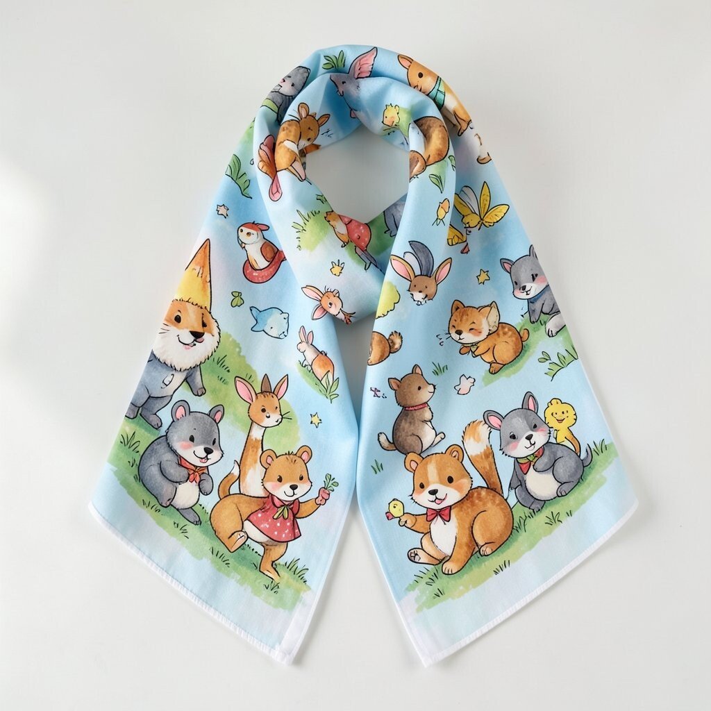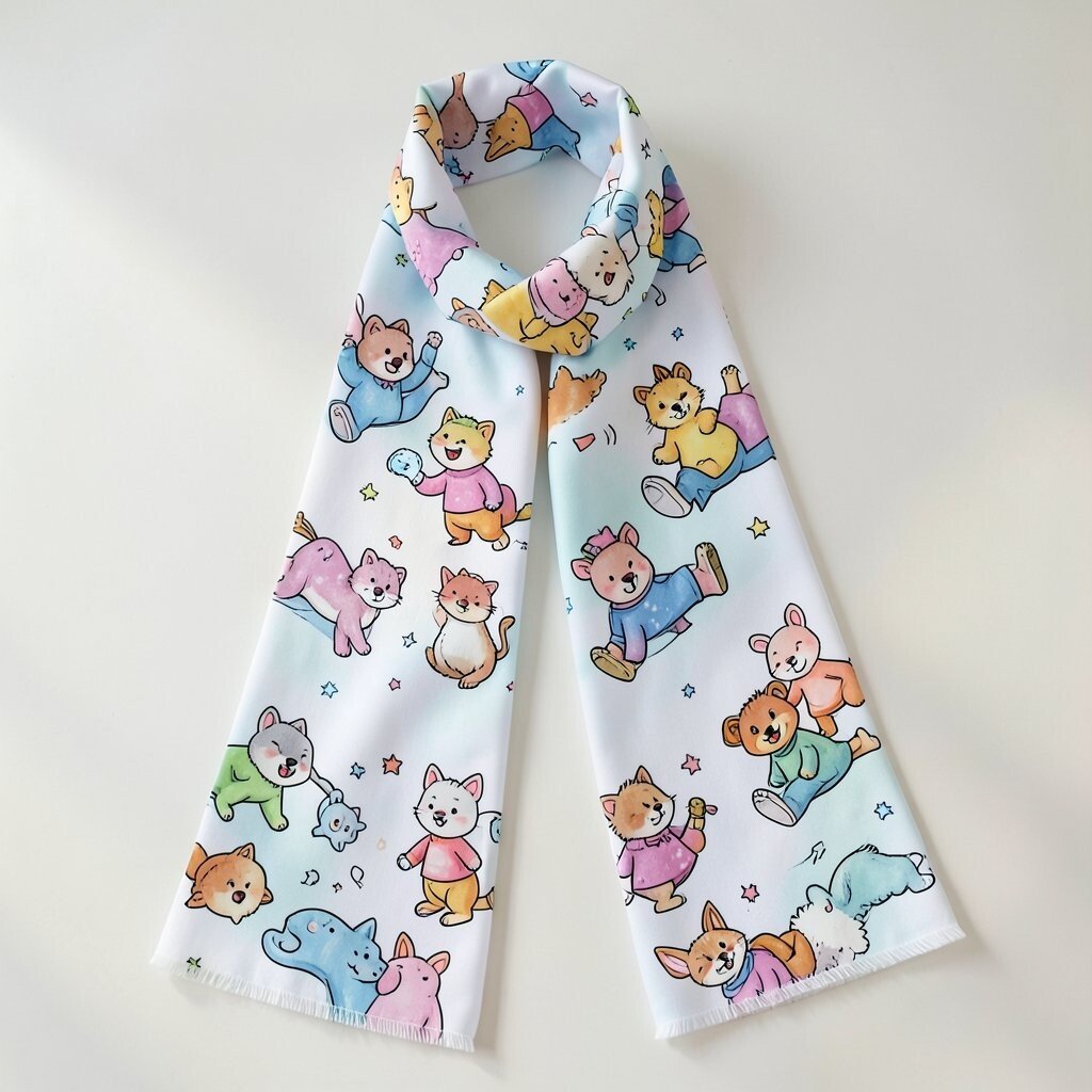 Animal cartoon scarves often show cats, dogs, bears, bunnies, or tiny forest pals. The print can feel sweet, funny, or full of tiny adventures.
