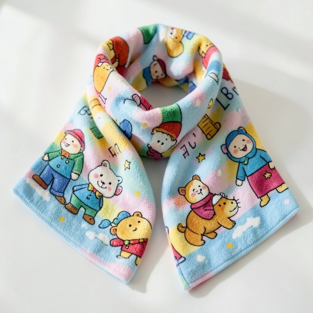 Some cartoon scarves use warm knit or fleece fabric with printed characters on top. The look feels cozy, soft, and ready for cold days.
