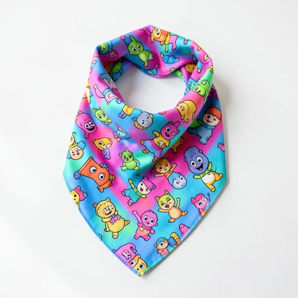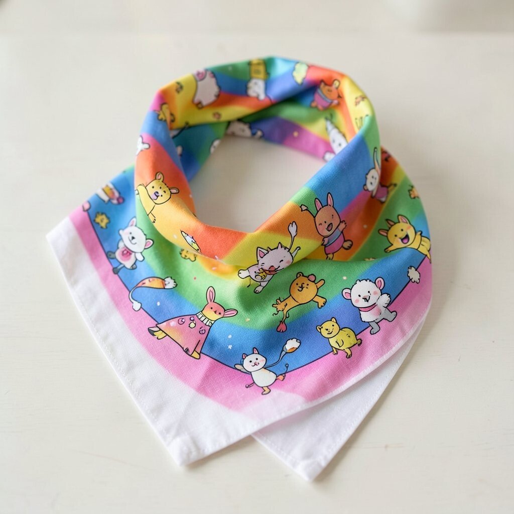 Rainbow cartoon scarves feel bright, cheerful, and full of energy. The mix of colors can make the characters look even more lively.