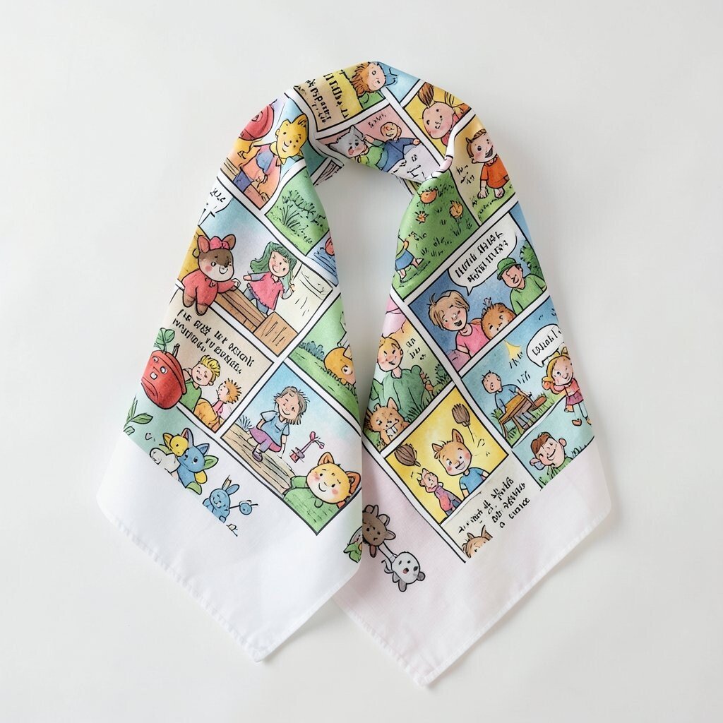 Comic-panel scarves use framed scenes, speech bubbles, and lively action lines. The result feels playful, like wearing a tiny comic strip.